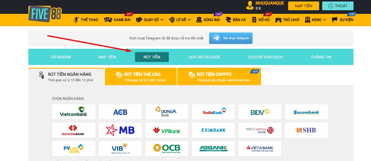 Để rút tiền Five88, bạn có thể lựa chọn giữa hai hình thức sau: